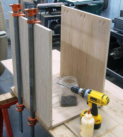 - Select the two, Side Panels and four, Corner Posts; Using two Pipe Clamps, clamp two posts to each side and using glue and Kreg Screws, screw the Side Panels to the Corner Posts (Note: the Dado cuts should all be aligned)
